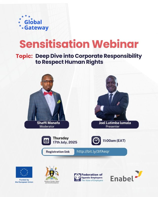 In 2021, Uganda was the first African country to pass the National Action Plan on Business and Human Rights (BHR) 2021-2026 based on the UN Guiding Principles on Business and Human Rights. This milestone is a result of research studies that led to the development of the NAP. In light of this, we have partnered with Enabel to conduct knowledge sharing webinars to expound on BHR at the workplace. We conducted a sensitisation themed, ‘Deep Dive into Corporate Responsibility to Respect Human Rights’ on 17th July. The keynote presentation was deliver by Mr. Joel Lutimba Lumala, the Business and Human Rights Field Officer, Enabel.