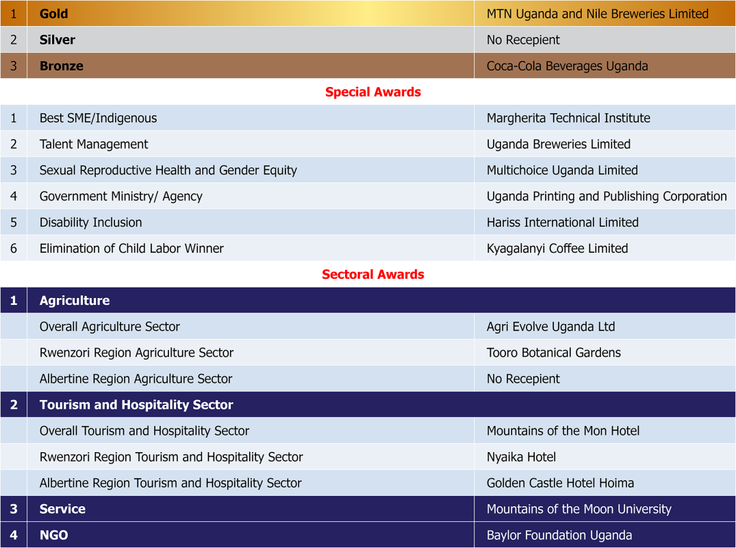 Mr. Douglas Opio, Our Chief Executive Officer FUE reiterated the focus of the EYA survey on job creation in line with the National Development Plan (NDP) 4 to create over 880,000 jobs annually to eliminate unemployment. He emphasised the need for all Employers across all sectors and regions to advance decent work and contribute to sustainable development efforts through participating in initiatives like the EYA survey to measure progress. He appreciated the EYA partners and sponsors including the Ministry of Gender, Labour and Social Development (MGLSD), Enabel, International Labour Organisation (ILO), Vision Group, Makerere University, National Union of Disabled Persons of Uganda, Danish Family Planning Association and Uganda Insurers Association (UIA) for their immense contribution to the success of the awards ceremony.